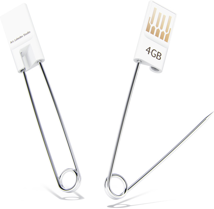 Сегодня можно встретить флеш-брелоки совершенно разных форм и расцветок, а миниатюризация приводит к тому, что их основная часть подчас даже меньше стандартного разъёма USB. В студии Артемия Лебедева решили уйти от идеи брелока и обыграть концепцию флеш-накопителя в виде булавки, благо современные технологии вполне позволяют создать такой продукт.