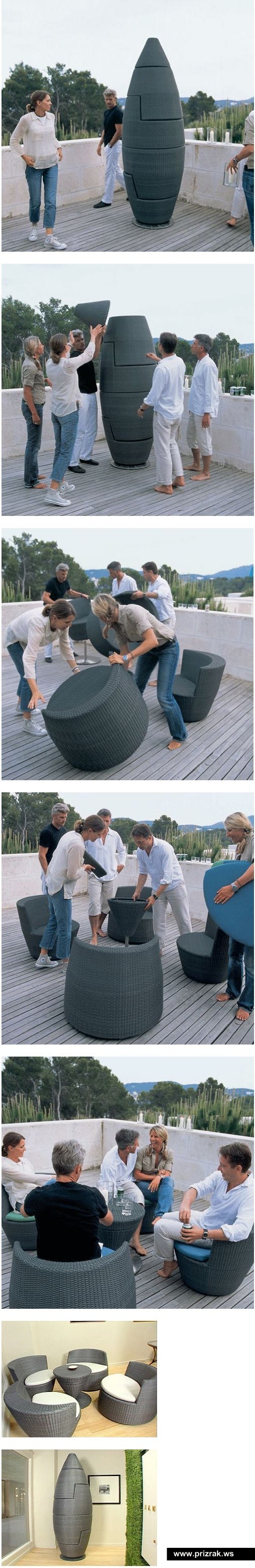 Отгадано: мебель то есть кресла (стулья) со столом все это собирается и разбирается вот в такую пирамиду - статую https://upforme.ru/uploads/0000/35/39/402672-1-f.jpg